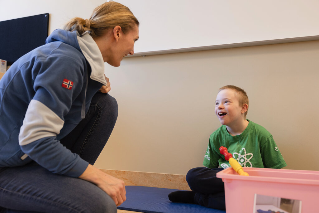 Elev Adrian Holen Ødegaarden og lærer i lek på Fjerdingby ressursavdeling