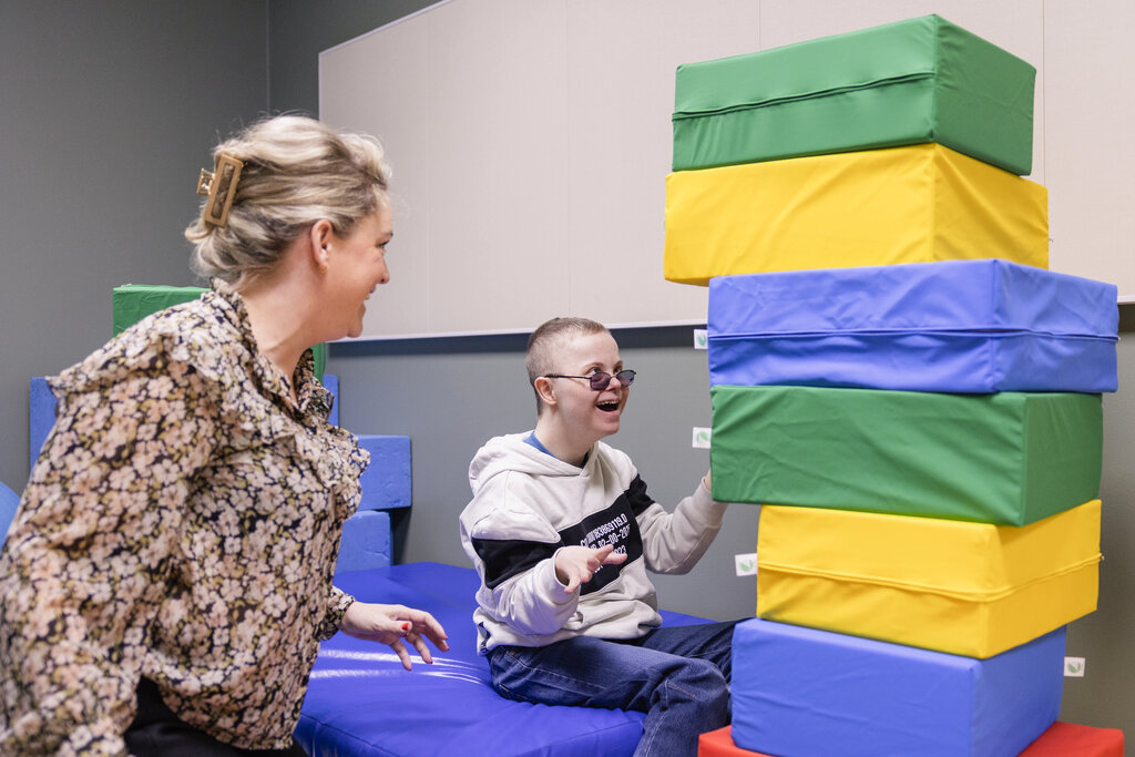 Elev Jonas Sandvik og lærer i lek på Fjerdingby ressursavdeling