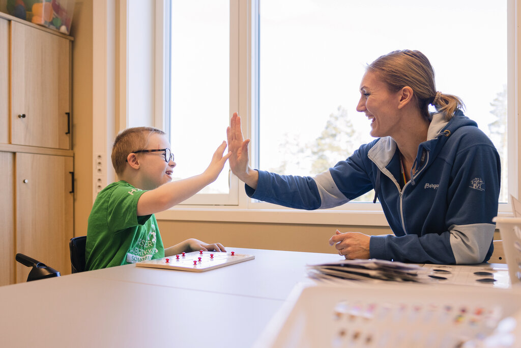 Elev Adrian Holen Ødegaarden og lærer i lek på Fjerdingby ressursavdeling