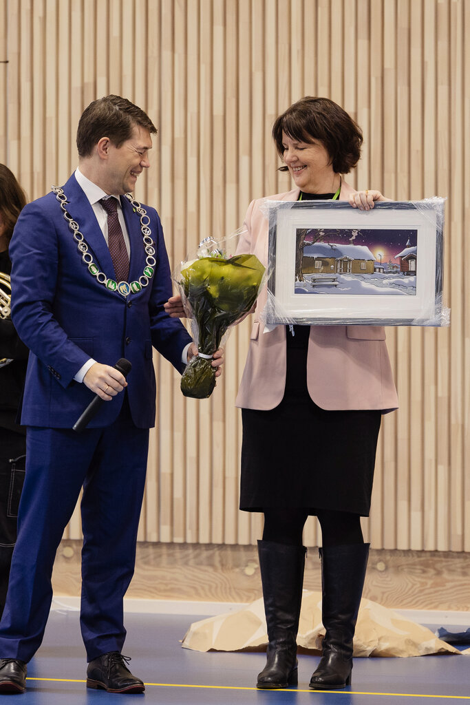 Ordfører Ståle Grøtte overrekker en gave til rektor Inger-Jorunn Andersen. Bildet viser Rælingen bygdetun.