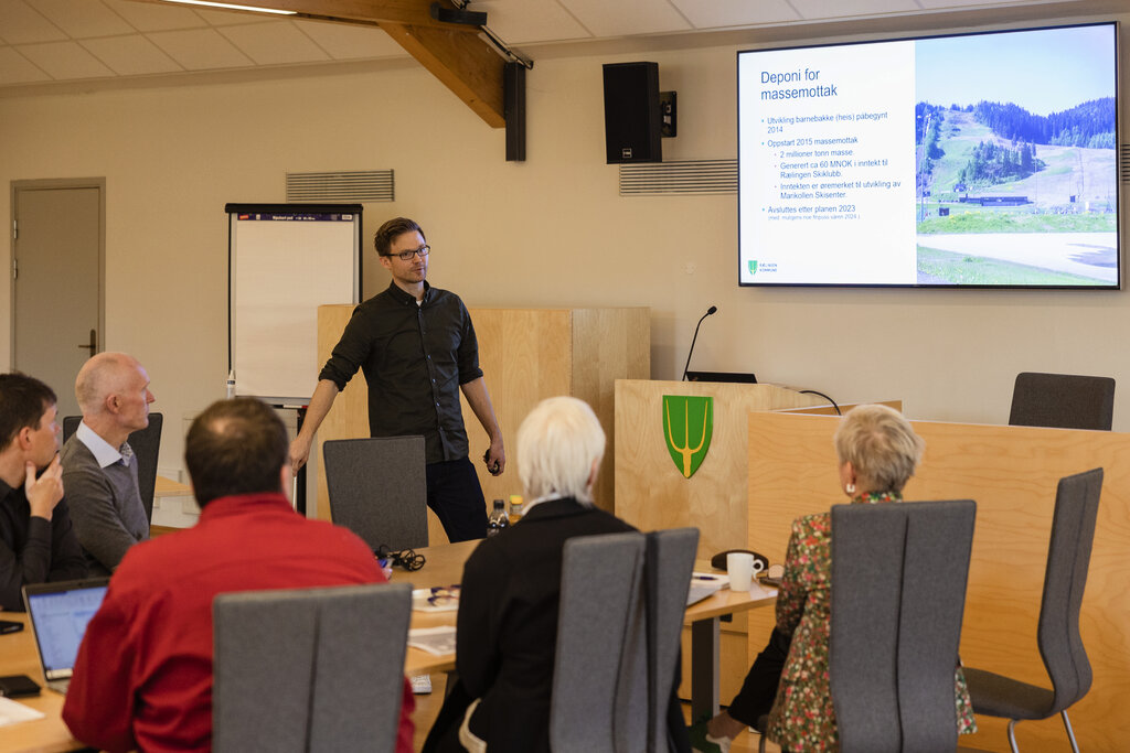 Avdelingleder for IFF, Pål Thoreid, presenterer planer for idrettsanlegget i Marikollen i kommunestyresalen på rådhuset.