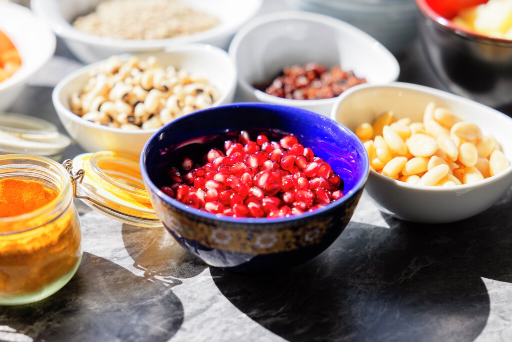Granateplekjerner, krydder og belgfrukter.