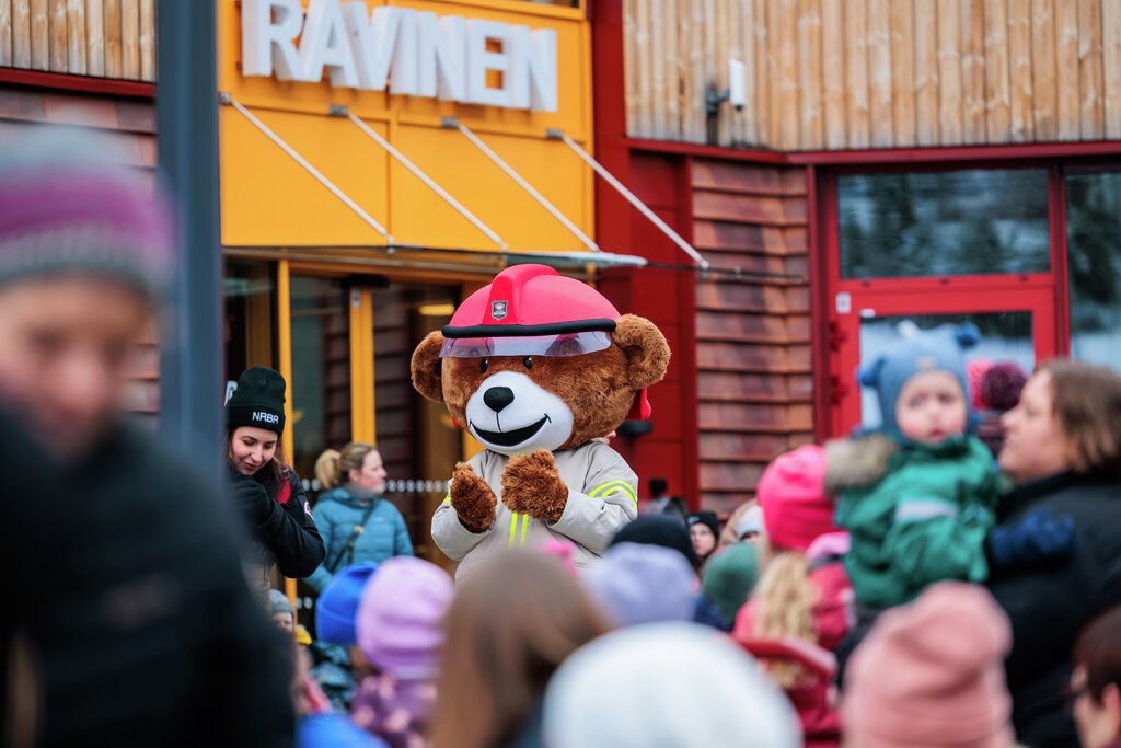 Brannbamsen Bjørnis og Nedre Romerike brann- og redningsvesen (NRBR) underholder på Marikollen torg.