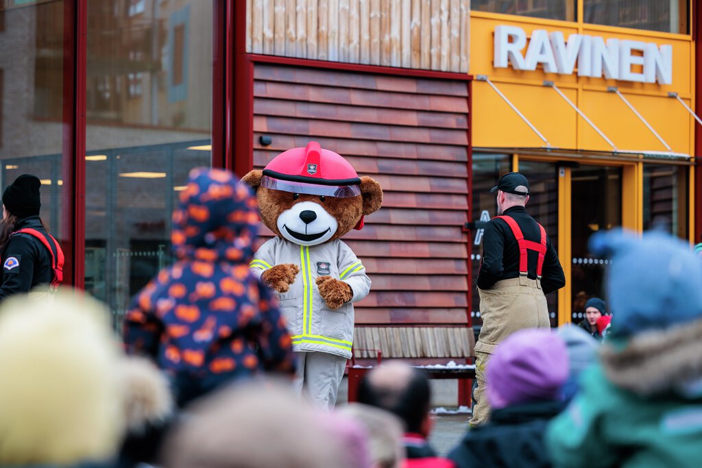 Brannbamsen Bjørnis og Nedre Romerike brann- og redningsvesen (NRBR) underholder på Marikollen torg.