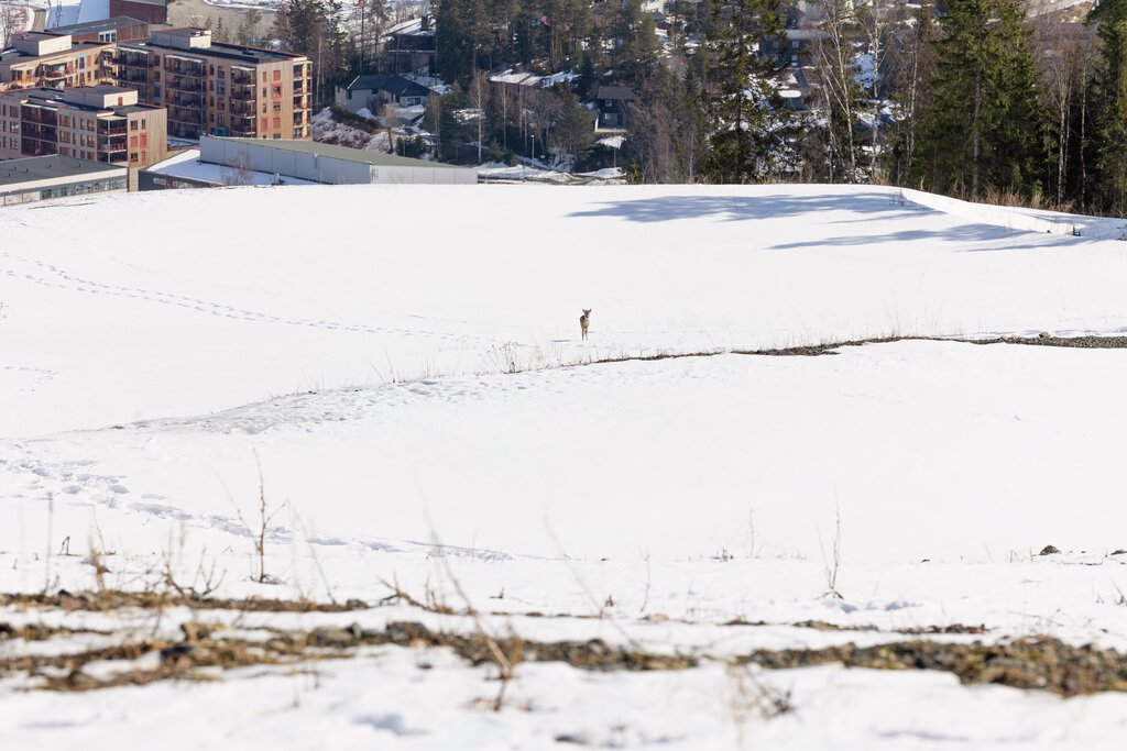 Utsikt fra Marikollen mot Fjerdingby, med et rådyr i forgrunnen.