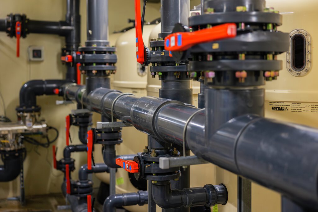 Rør og ventiler i det tekniske rommet under Sandbekken bad